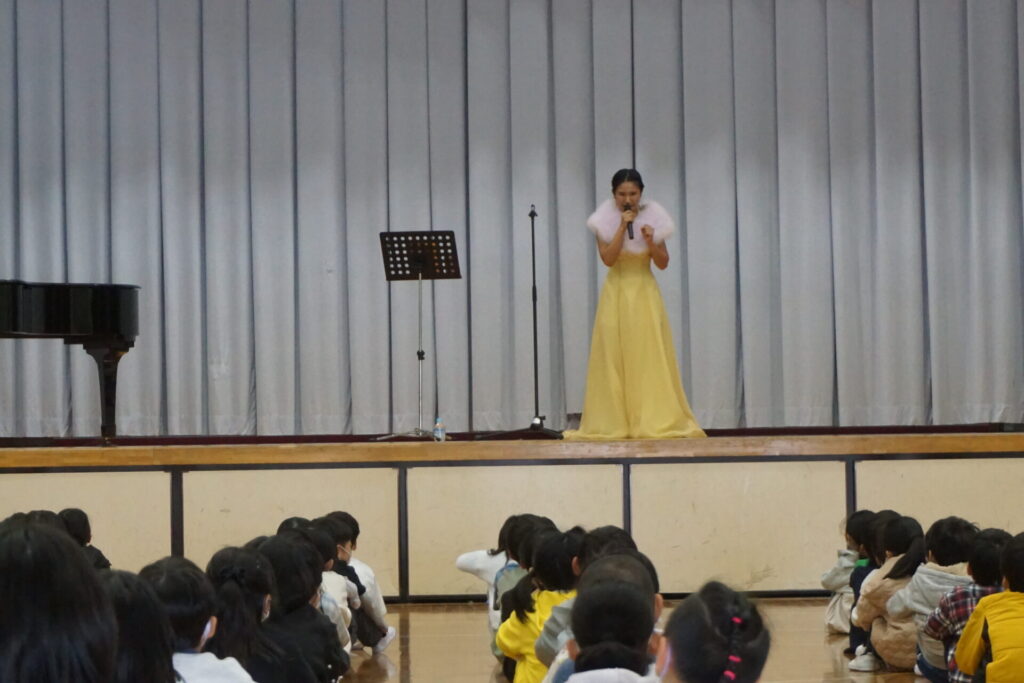 本日、本校(旧 妻沼南小学校)卒業生で、今はウィーンを中心にオペラ歌手として活躍されている岡﨑麻奈未さんをお迎えして、オペラ鑑賞会が開かれました。