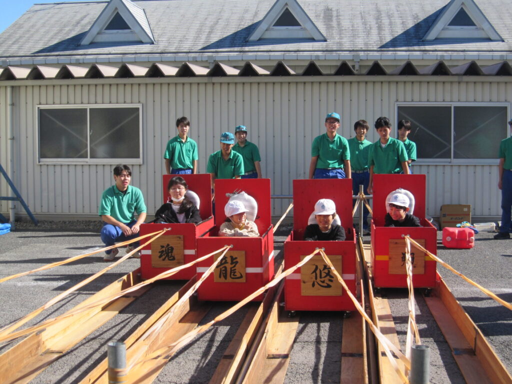 高校生が制作したゴムコースターに乗ったり、ドローンを使って空撮した映像を見せてもらったり、