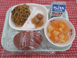 【牛乳 黒パン ソース焼きそば ミートボールの甘辛煮 フルーツポンチ】