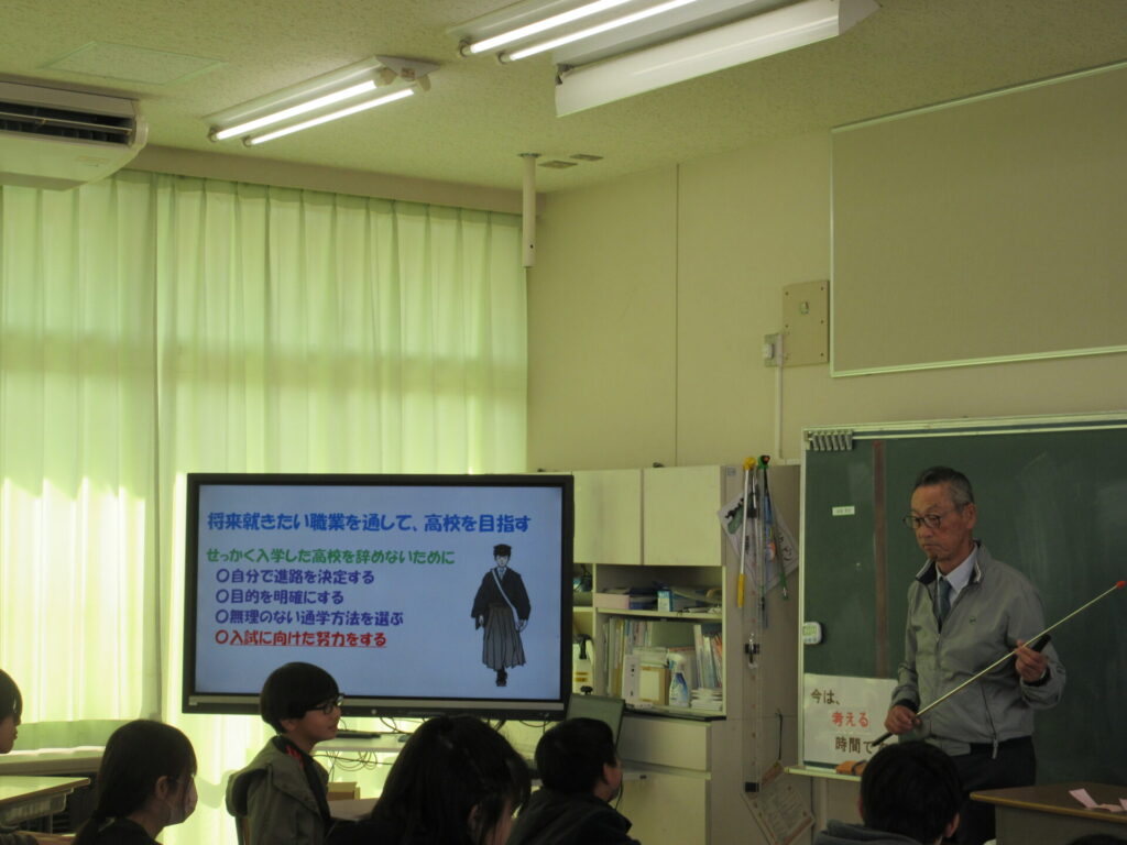 もうすぐ中学校へと進級する6年生に向けて、大谷校長が、その先の高校進学、将来に向けてのキャリア教育講話を行いました。
