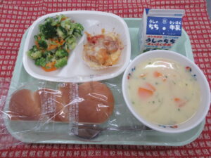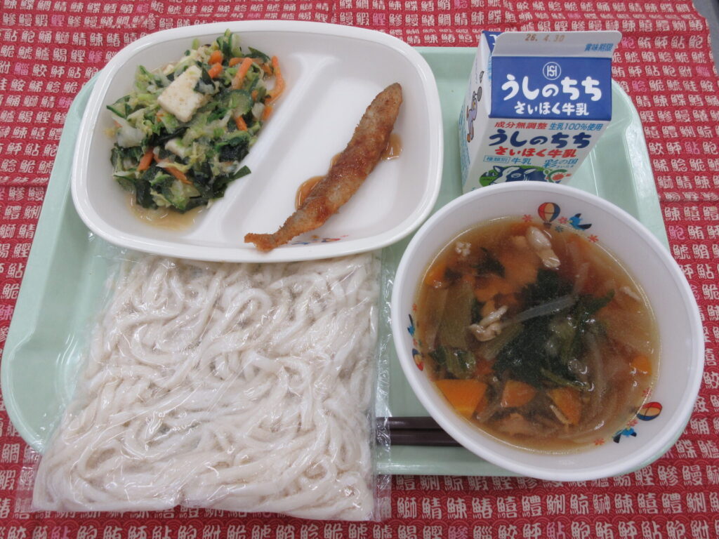 今日の給食は主食が麺の給食です。1年生にとっては2度目の麺です。