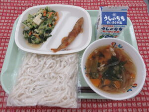 【牛乳 地粉うどん 肉うどん汁 ししゃもフライ 温野菜味噌ドレッシング】
